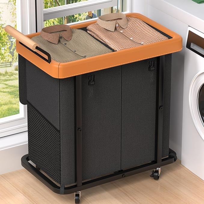 50 Gal (190L) Laundry Hamper 2 Section with Lid,Leather Patchwork Laundry Basket with Rolling Lockable Wheels and Wooden Handle,Clothes Hamper Cart with Sturdy Metal Frame for Laundry Room - Black, AC