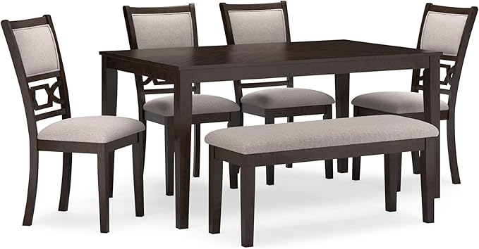 Signature Design by Ashley Langwest Transitional Diamond Patterned Dining Table with 4 Upholstered Chairs and Bench, Set of 6, Dark Brown & Beige +