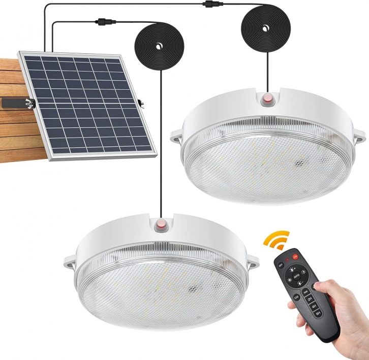 SunBonar Solar Ceiling Lights Indoor Outdoor 2 Pack, Dimmable Daytime 3000K/4000K/6000K Solar Shed Lights with ON/Off Switch & Remote, Waterproof Barn Lights for Home Porch Chicken Coop, AC +