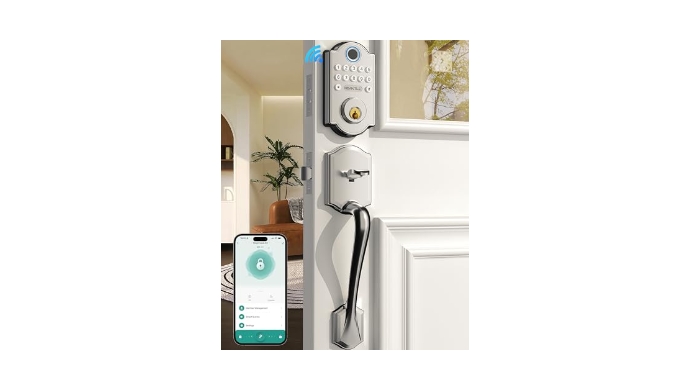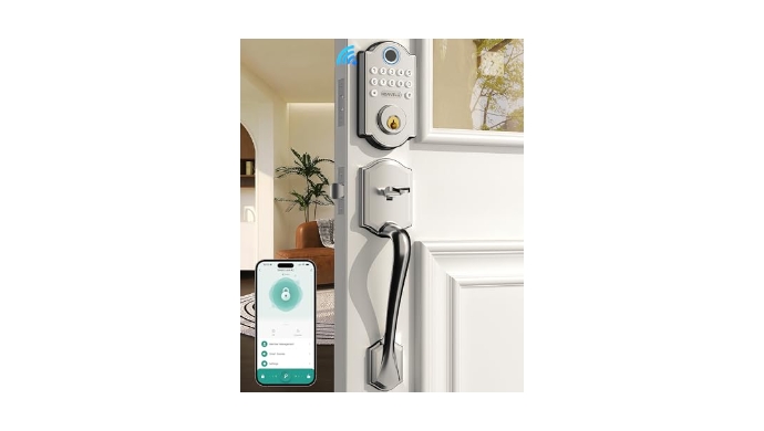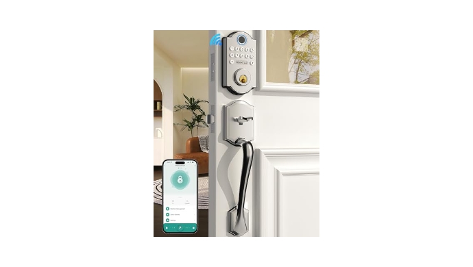 Keyless Fingerprint Door Lock Set: HEANTLE WiFi Front Door Lock with Handles - Alexa Smart Electronic Digital Keypad Deadbolt Sets App Remote Control Auto Satin Nickel +