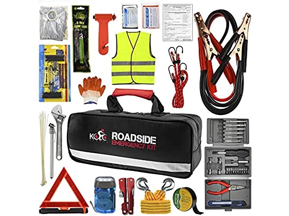 Roadside Emergency Car Kit - 156-Piece Multipurpose Emergency Pack with Automotive Tools and First Aid Kit - Car Tool Kit Includes Heavy-Duty Jumper Cables and Tire Pressure Gauge