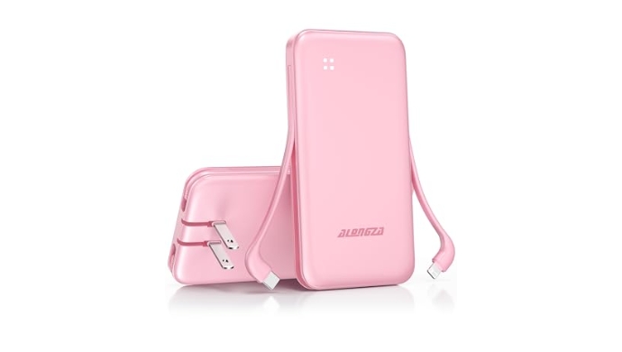 Alongza Portable Charger Built-in Cables and AC Wall Plug, Slim Fast Charging Power Bank 10000mAh, Lightweight USB C External Battery Pack Compact Travel Cell Phone Charger +