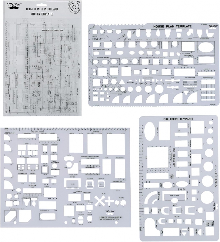 Mr. Pen- House Plan, Interior Design and Furniture Templates, Drafting Tools and Ruler Shapes for Architecture - Set of 3