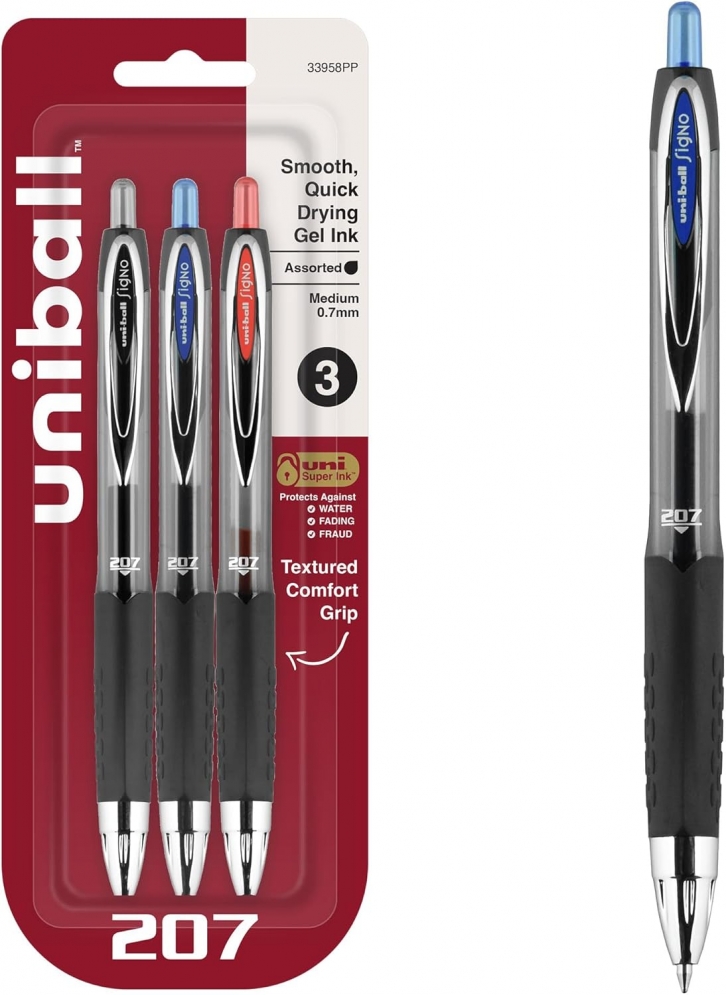 Uni-Ball 207 Medium Point Retractable Gel Pen Assorted 3-Pack +FSSS