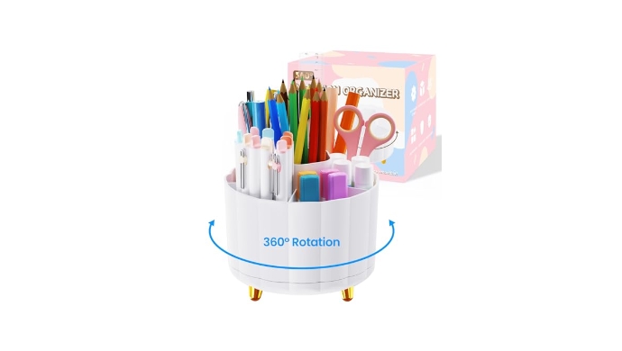 IVEETTY Pen Holder for Desk Organizer Caddy 360 Rotating, Pencil Holder for Desk or Classroom, Makeup Brush Holders with 6 Slots, Cute Pen Organizer & Pencil Cup, Workspace Organizers, White +