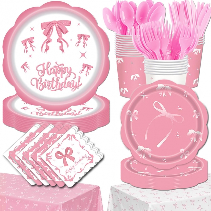 194pcs Pink Bow Birthday Plates Napkins Cups and Tablecloth Set Serve 24, Pink Bow Party Supplies for Girl Bachelorette Decor Bridal Engagement Baby Shower Decorations, AC