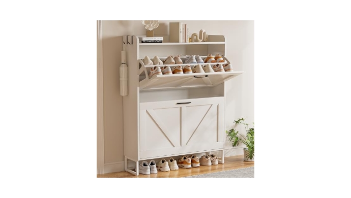 EOYUTLLY Shoe Cabinet for Entryway with 2 Flip Drawers,Narrow Wooden Shoe Storage Cabinet with Metal Legs,Hold 24 Pairs, 4-Tier Adjustable Shelves–Freestanding Hidden Shoe Organizer for Hallway, Foyer +