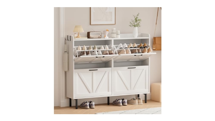 EOYUTLLY Shoe Cabinet Storage for Entryway, Narrow Shoe Rack Cabinet with 4 Flip Drawers, Freestanding Hidden Shoe Rack Storage Organizer, White with Metal Legs +