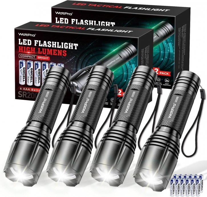 WdtPro LED Flashlight High Lumens SR2000 Pro, 4 Pack Brighter Tactical Flashlights with 5 Modes & Zoomable, Powerful Mini Flash Light for Emergency, Camping, Hiking (Black), AC +
