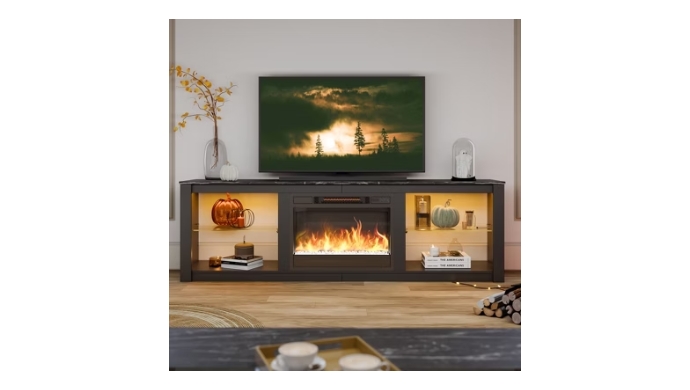 Bestier 71" Fireplace TV Stand for TVs Up to 75", Modern TV Stand with 36" Electric Fireplace with LED Lights & Shelves for Living Room, Black +