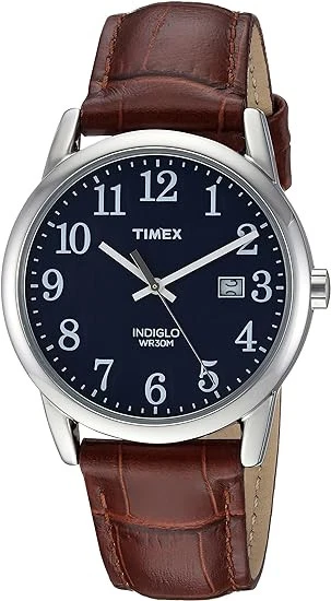 - Timex Mens Easy Reader 38mm Watch - Silver-Tone Case Blue Dial with Brown Croco Leather Strap.