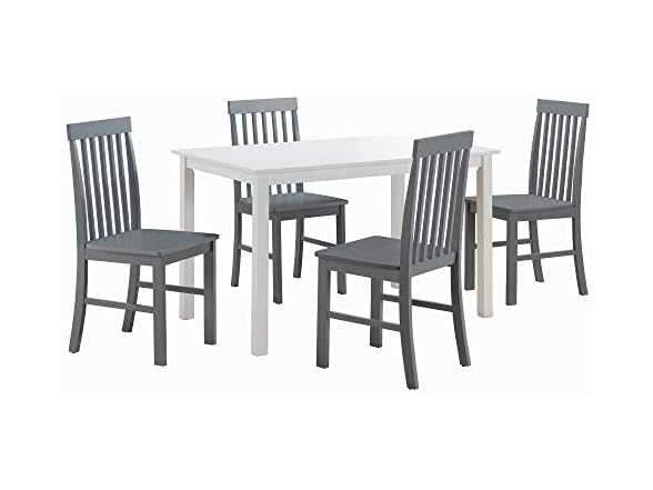 Product Description: Take your kitchen or dining area to the next level with our modern style dining set. Including four slatted back chairs with slightly curved angles throughout, in a colored finish. The table features a classic, straight-line design with a painted, fresh white finish for a simple, yet elegant table. Enjoy meals with your family, with this stylish dining set. Ships ready-to-assemble with step-by-step instructions.