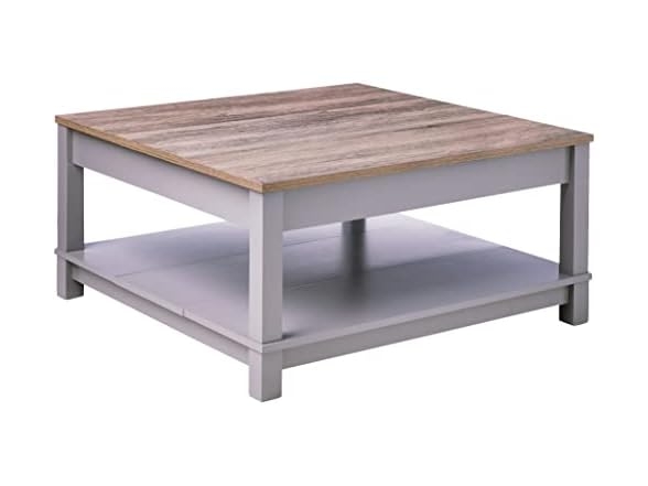 Product Description: Add a touch of sophistication to your living room with the Ameriwood Home Carver Coffee Table. The soft gray finish will blend effortlessly into any decor style, and the distressed brown woodgrain top gives the table a rustic charm. The coffee table features a bottom storage shelf ideal for holding books and magazines so the top surface can stay open and free of clutter. The table is made of painted MDF and laminated particleboard. It stands at 17”h x 35.4”w x 35.4”d and is recommended to be assembled by 2 adults.