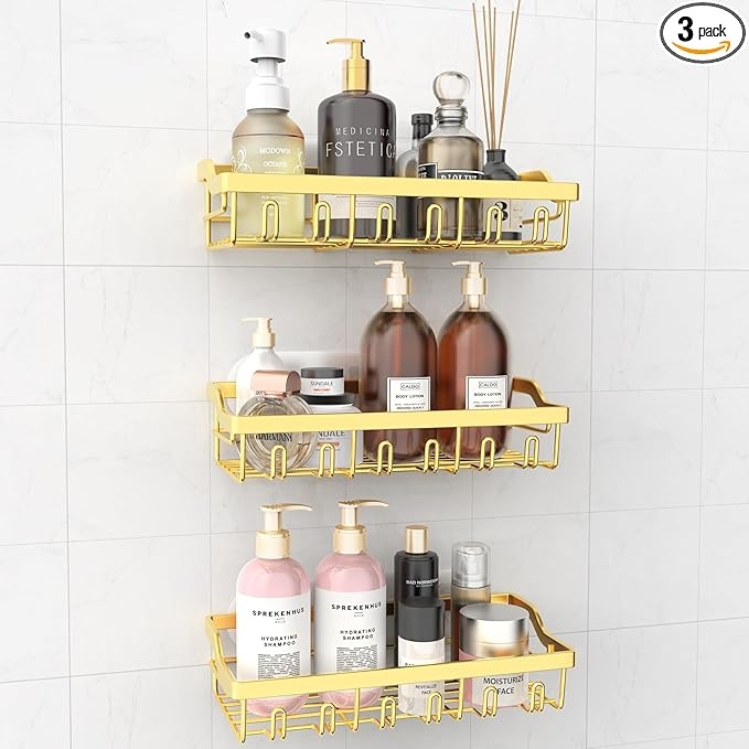 Amazon offers 3 Pack Shower Caddy, Adhesive Shower Organizer for Bathroom Storage, Rustproof Stainless Steel Shower Shelves, No Drilling, Large Capacity Shower Rack Shelf for Inside Shower, Gold for after coupon + free shipping with Prime. #ad Apply Code: S9JTVSBZProduct Description: