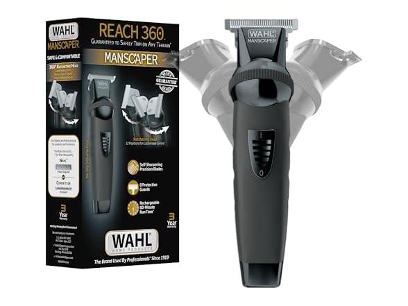 Product Description: Discover the Wahl Manscaper® Reach 360 Ratchet Head Cordless Body and Beard Trimmer for Men, designed to improve visibility during your grooming experience. Its innovative 360° ratcheting head offers 12 rotation angles for enhanced visibility and to provide a more comfortable hand holding position while trimming tricky angles, ensuring precise trimming for the entire body. The no-slip silicone grip provides a soft, yet tactile grip while trimming. Whether it's your beard, chest, body, legs, or groin, this trimmer is perfect for your all over grooming needs. The self-sharpening T-blade provide a safe and smooth trim on any body grooming surface, backed by our no nicks and no pain guarantee. Customize your trimming lengths with the 8 included guide combs, with cutting lengths 1/16”, 1/8”, 3/16”, 1/4", 5/16”, 3/8”, 7/16”, & 1/2". Enjoy the convenience of rechargeable operation with up to an 80-minute cordless runtime, allowing for uninterrupted grooming sessions. Note: This trimmer is made for usage in the USA only. We test our Wahl hair trimmers for men for cutting performance prior to packaging with an hygienic fiber. We do our best to clean the product to remove any testing particles, but it is possible a few may remain. They are not hair and can be simply wiped off. Category: Beauty & Personal Care Posted on 27 August 2025, 01:42 PM