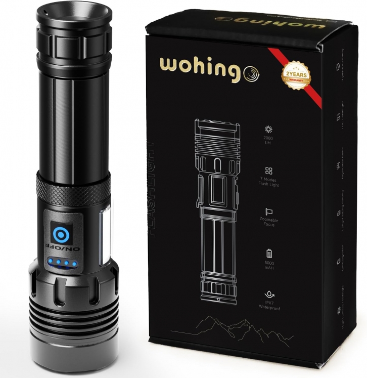 - [Durable & Waterproof]: This heavy duty flashlight is made of solid aviation-grade aluminum, with excellent impact and scratch resistance, rugged, durable and drop-proof.The flashlight adopts a fully sealed design with a built-in high-density rubber seal, camping lights super bright rechargeable is not afraid of outdoor rain and snow. Whether you are camping, walking the dog, fishing at night or exploring the outdoors, the Wohingo hand Flashlight is your ideal choice
