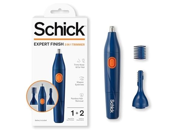 $9.99 Schick Hair Trimmer, 3-in-1 Trimmer for Nose, Ear & Eyebrows, Painless Hair Removal, Cordless, Quick-Change Attachments, Waterproof, Expert Finish, Unisex GroominWoot offers Schick Hair Trimmer, 3-in-1 Trimmer for Nose, Ear & Eyebrows, Painless Hair Removal, Cordless, Quick-Change Attachments, Waterproof, Expert Finish, Unisex Groomin for $9.99 (orig. $18.02). Free shipping for Prime Members.
