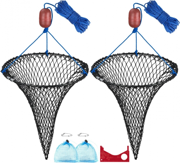 - Package Included: Mesh size: 1 inch; The crab trap weight: 0.64 lb. The package includes: 2 x 13*19.8 inches crab nets, 2 x 49 feet PE Rope, 1 x Crab Gauge, 2 x Bait Bag and Pins.