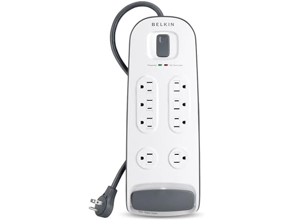 Product Description: 3000 joule rating. Phone line protection ensures open and continuous phone line with 1 in, 2 out RJ11 connections. Low profile plug fits easily in tight spaces and behind furniture. Large recessed power switch prevents accidental shutdowns and makes system resets easy. Surge protection Indicator lets you know your equipment is secure and protected. Sliding safety covers protect children and keep dust and debris out of unused outlets. BlockSpace outlets accommodate large power adapters without blocking outlets. Dollar 100,000 connected equipment warranty. Mounting holes easily secure the surge protector to walls, baseboards, or furniture. 6' power cord. Category: Electronics (other) Posted on 20 September 2025, 07:32 AM
