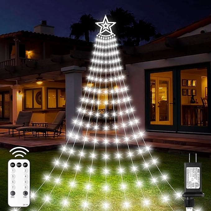 Amazon offers Christmas Decorations Star Lights Outdoor, 11.48ft 350 LED Waterfall Tree Lights with 8 Modes Timer Remote Plug in Christmas Lights for Indoor Yard Patio Home Holiday Party Decor, Pure White for + free shipping with Prime. Product Description:- 2024 Upgraded Christmas Decoration Lights: This led Christmas star light has 350 super bright LED light beads, distributed in 9 strings. The top star diameter is 11.8 inch. Length of each string: 11.48 feet. 10 ground spikes included,the Plug cable length: 16.4ft. Perfect size for you to decorate your house or yard, creating vibrant Christmas atmosphere for your home