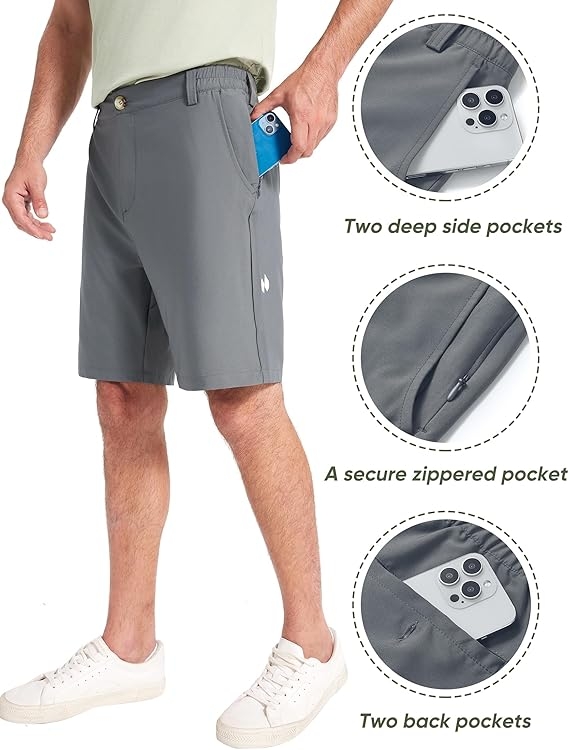 - MULTI-POCKETS: The men's golf shorts have 2 side pockets, 1 invisible zipper pocket, and 2 button-closed back pockets, the large capacity pockets are convenient for you to storage phone wallet safely