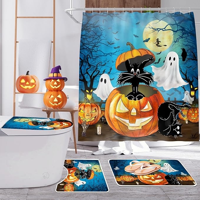 - Complete Halloween Bathroom Set: This 4-piece bathroom decor set includes everything you need for a Festival: a shower curtain (with 12 rings), a non-slip rug, a toilet lid cover, and a U-shaped mat. The polyester shower curtain features durable Halloween-themed designs, while the absorbent mats help keep floors dry. Perfect for creating farmhouse Halloween fun in your bathroom.