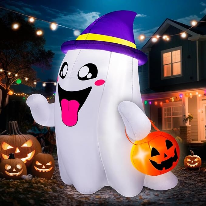 Amazon offers 5FT Halloween Inflatables Ghost with Pumpkin Halloween Decorations Outdoor Built-in Bright LED Lights Blow Up Yard Decoration Blowups for Garden Lawn Indoor Party Holiday for + frees shipping with Prime. Product Description:- 【5FT Halloween Inflatables Wandering Ghost with Bright LED Lights】zukakii designed cute Halloween decoration outdoor features a ghost-like body shape with a sense of wandering, wears a witch hat and carries a glowing pumpkin, its mischievous face expresses a cheerful Halloween spirit! The built-in bright LEDs are meant to light up your yard, bringing joyful laughter to your Halloween party