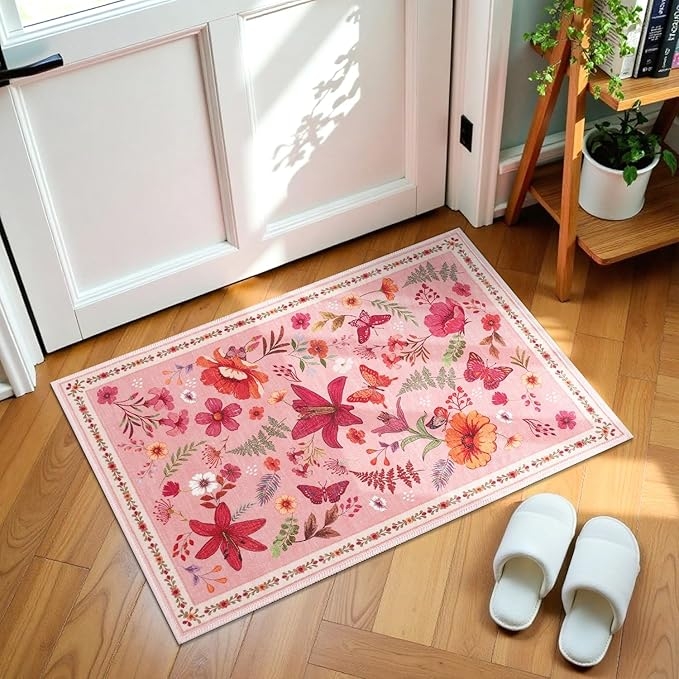 Amazon offers Boho Floral Small Area Rug 2x3, Machine Washable Indoor Entrance Door Mat, Non-Slip Low Pile Throw Rugs for Kitchen, Bathroom, Entryway, Front Door Indoor Entry, Cute Girls Pink Thin Carpet for + free shipping with Prime Product Description:- 🌸Vibrant Floral Rug:Featuring a beautiful floral and butterfly pattern with vibrant colors and intricate details, this floral rug adds a touch of elegance to any space. The beautiful pattern makes you feel like you're dancing among butterflies in a blooming garden, adorning your home with the joy ambiance of spring all year round