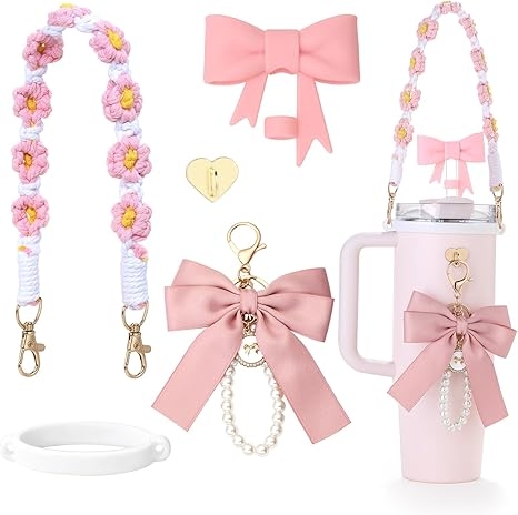 Amazon offers Stanley Cup Accessories Set- Water Bottle Handle Strap, Bow Silicone Straw Cover, 5 PCS Stanley Charms for Stanley Cups 30 oz 40 oz Tumbler (Pink or Purple) for + free shipping with Prime. Product Description:- 【Personalized Style】: A full set of stanley cup accessories use delicate bow elements and floral themes to personalize your water bottle and make it even more stylish and beautiful. Cup accessories come in a wide variety of colors that match your stanley cup.