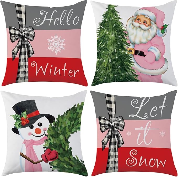 - CHRISTMAS DECORATION:Our Christmas Pillow Covers are designed with full of Christmas elements,double-Side Print, which adopts to pink buffalo plaid style with Snowman and Christmas tree. Create a warm Winter Christmas holiday atmosphere for you