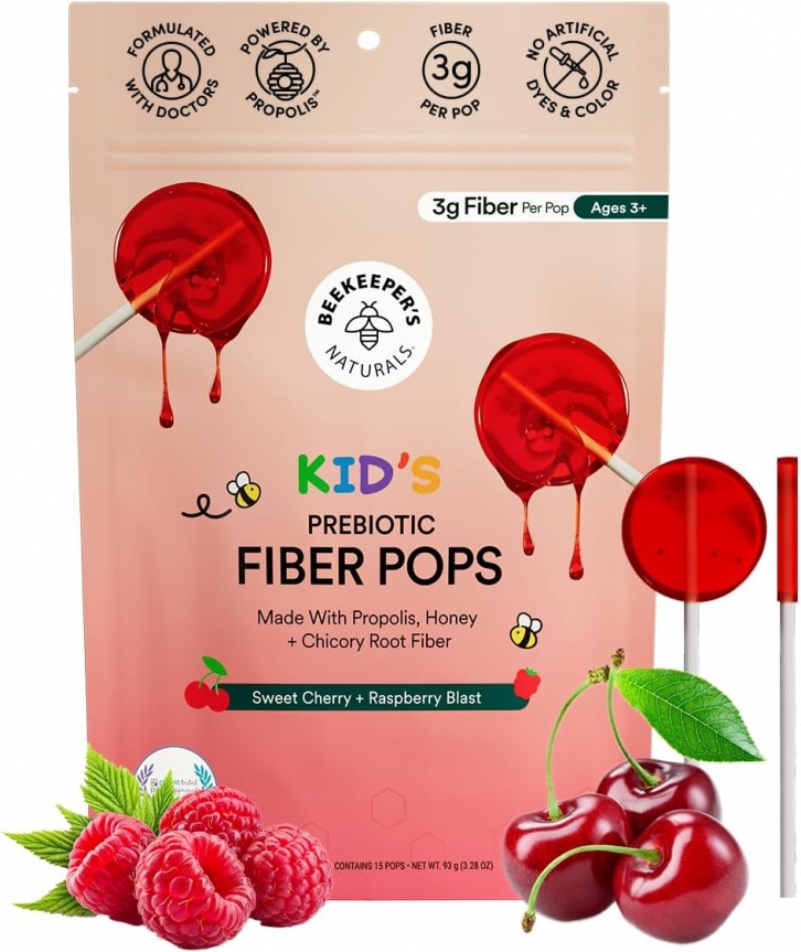 Amazon offers Kids Prebiotic Fiber Lollipops by Beekeeper's Naturals - Doctor Formulated Fiber Supplement, Supports Digestive Regularity, 3g of Fiber & Honey, Raspberry Blast & Sweet Cherry Variety Pack, 15 ct for with subscription & coupon + free shipping. Note: Clip 20% coupon on the product page and buy with subscribe & save! Product Description:- DOCTOR FORMULATED, PREBIOTIC & FIBER LOLLIPOPS: Support your child’s digestion and regularity with our Kid’s Propolis Fiber Pops. Naturally sweetened with honey, it’s the daily choice kids love and parents trust.