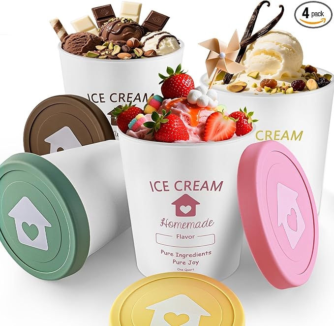 - Ideal Size & Colorful Convenience: Each ice cream container holds 1 quart, ideal for homemade treats. This 4-pack features vibrant, color-coded silicone lids for easy flavor ID and a neat, organized freezer, so you can grab your favorite ice cream anytime