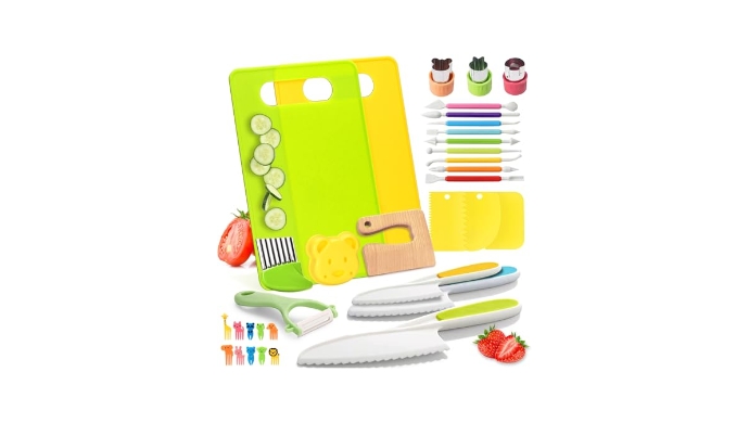 $9.49 34 Pcs Montessori Kitchen Toys for Toddlers-Kids Knife Sets for Real Cooking with Safe Knives, Serrated Plastic Knives, Potato Slicers, Sandwich Cutter, Peeler and Cutting Board +FS1Sale offers 34 Pcs Montessori Kitchen Toys for Toddlers-Kids Knife Sets for Real Cooking with Safe Knives, Serrated Plastic Knives, Potato Slicers, Sandwich Cutter, Peeler and Cutting Board for $9.49 (orig. $19.99) +Free Shipping
