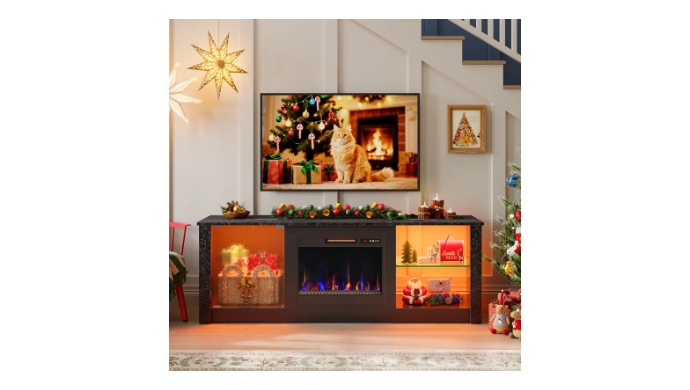 1Sale offers Bestier 63 in. Freestanding Electric Fireplace TV Stand Media Console Fits TVs Up to 70 in. with Cabinet in Black Marble for $179.99 (orig. $263.99) +Free Shipping Free Shipping Welcome to modern comfort. The 63" Electric Fireplace TV Stand seamlessly blends warm, customizable ambiance with sleek functionality. Create your ideal atmosphere with vibrant flame colors and cozy heat, all controlled from the comfort of your couch. Features - Realistic Heating & Ambiance: Features a 23" electric fireplace insert with lifelike 3D flames, providing efficient heating for spaces up to 400 sq. ft (5120 BTU). Adjust temperatures from 62°F to 92°F and customize 7 flame colors, 5 brightness levels, and 5 flame speeds via the convenient 26ft remote.