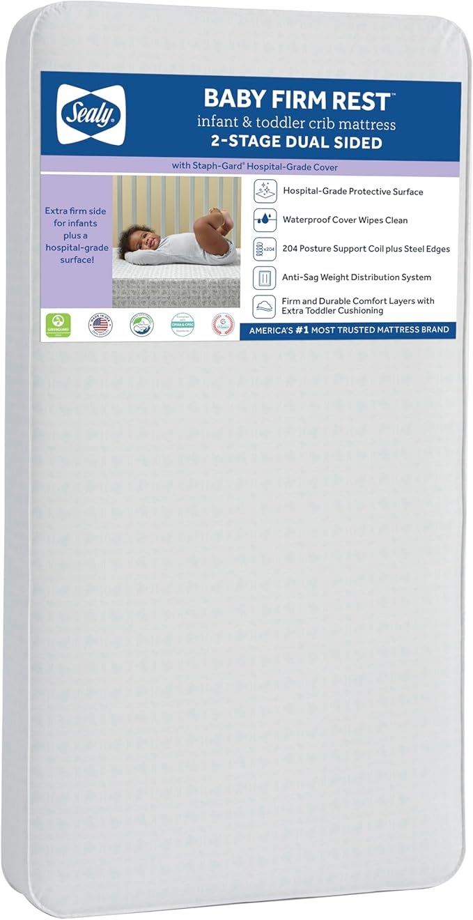 Amazon offers Sealy Baby Firm Rest Antibacterial 2 Stage Waterproof Crib Mattress plus Toddler Bed Fit, 204 Steel Coils, Non Toxic, GREENGUARD Gold Certified, Safety & Quality Tested, Made in USA, 52"X28" for after coupon + free shipping with Prime. Note: Clip 50% coupon on the product page! Product Description:- ANTIBACTERIAL WATERPROOF COVER: EPA-registered and lab tested to help keep bacteria from spreading on the mattress surface. 100% waterproof, stain-resistant, tear-resistant to help keep the inside clean. Easy clean surface!