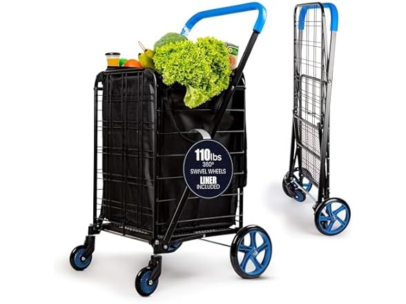 Woot offers SereneLife Large Folding Utility Shopping Cart with Removable Liner â Heavy Duty, 360° Swivel Wheels, 110 lb Capacity, Portable for Groceries, Laundry, Luggage, and More (Blue) for $15.99 (orig. $74.99) + free shipping with Prime. Product Description:- STURDY AND VERSATILE DESIGN - Built with a high-quality steel frame and tear-resistant, weatherproof fabric this shopping cart is ideal for grocery shopping, laundry, or luggage. Enjoy the convenience of a foldable shopping cart with wheels.