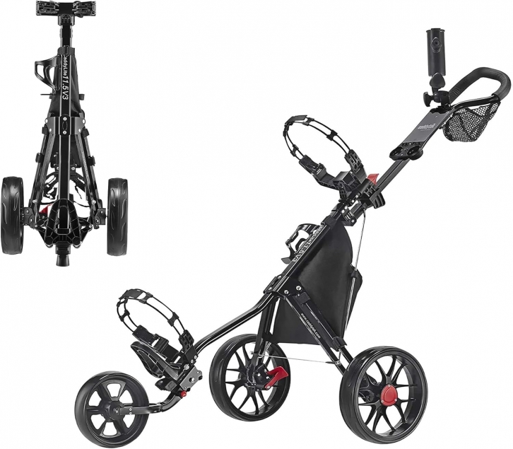 Amazon offers Caddytek CaddyLite 11.5 V3 Golf Push Cart - Lightweight Aluminum 3-Wheel Foldable Golf Bag Cart with Quad-Fold Frame, EVA Wheels, Adjustable Handle, Foot Brake, Mesh Net, Umbrella & Drink Holder for + free shipping with Prime. Product Description:- EASY FOLDING & PORTABILITY: This golf push cart features a 3-step quad-fold system that folds in seconds for compact storage. At just 13.75 lbs, this lightweight golf push cart is portable, trunk friendly, and perfect for travel and easy storage.