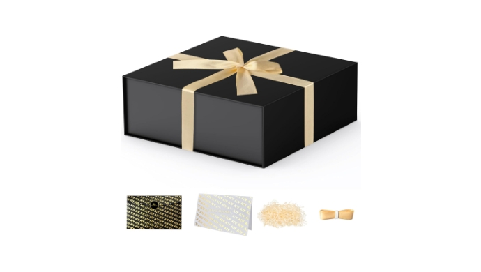 1Sale offers TILSWALL Gift Box 7.5''x7.2''x2.8'' Black Gift Boxes with Magnetic Lids for Presents, Rectangle Collapsible Luxury Gift Box for Proposal, Wedding, Christmas, Birthday, Contains Card, Ribbon, Filler for $9.99 (orig. $12.99) +Free Shipping Free Shipping with Amazon Prime Apply Promo Code HRI5H6W2 At Checkout - 【Classic Design & Multiple Uses in One Box】This black gift box for presents measures 7.5"x7.2"x2.8", offering ample space for gifts items. Each set is a complete gift wrapping, including: 1 gift box, 1 gift card, a 61.5" champagne colored ribbon, and 15g paper filler, ready to use right out of the box, saving time and effort for gift giving.