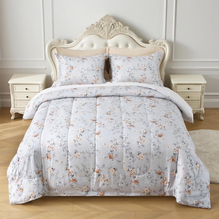 Amazon offers King Size Comforter Set, Floral Printed 7 Piece Bag in a Bag Bedding Set, Lightweight Farmhouse Comforter with Sheets, Grey and Orange Cute Flower Pattern Bedding Set for + free shipping with Prime. Product Description:- Soft Brushed Micrifiber Fabric: Our comforters king size set is made of premium ultra-soft double brushed microfiber fabric, breathable & silky,wrap yourself with it to make sure you sleeping comfortably every day