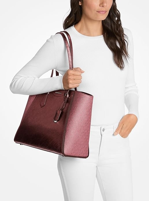 Amazon offers Michael Kors womens Taryn Large Multi-functional Top-zip Tote Bag for + free shipping with Prime. Product Description:- Crafted from metallic leather, this structured bag features trapeze stitching and a detachable lock charm. It unzips to reveal a spacious interior, complete with side pockets and a center compartment for your tablet or valuables.