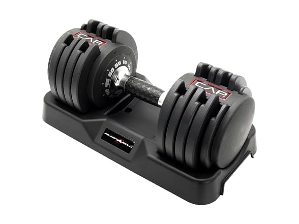 Product Description: Introducing the CAP 55 lb Single Adjustable Dumbbell with Contoured Full Rotation Handle that features the ADJUSTABELL weight adjustment system that is safe, quick, and easy to use! Simply turn the handle right or left to adjust the weight in 5 pound increments, pull up, and start your workout. Quickly and efficiently switch heavy weights for squats and lunges to lighter weights for curls and triceps extensions. No knobs to turn, pins to align, or levers to slide – just twist and go! The ADJUSTABELL weight adjustment system allows you to rapidly switch from one exercise to the next. The unique dial system combines 10 SETS of weights into ONE! The handles have a contoured, natural orientation for a comfortable, secure lifting position. Say goodbye to 10 sets of dumbbells and hello to the new ADJUSTABELL Dumbbell! US Patent 11,285,354
