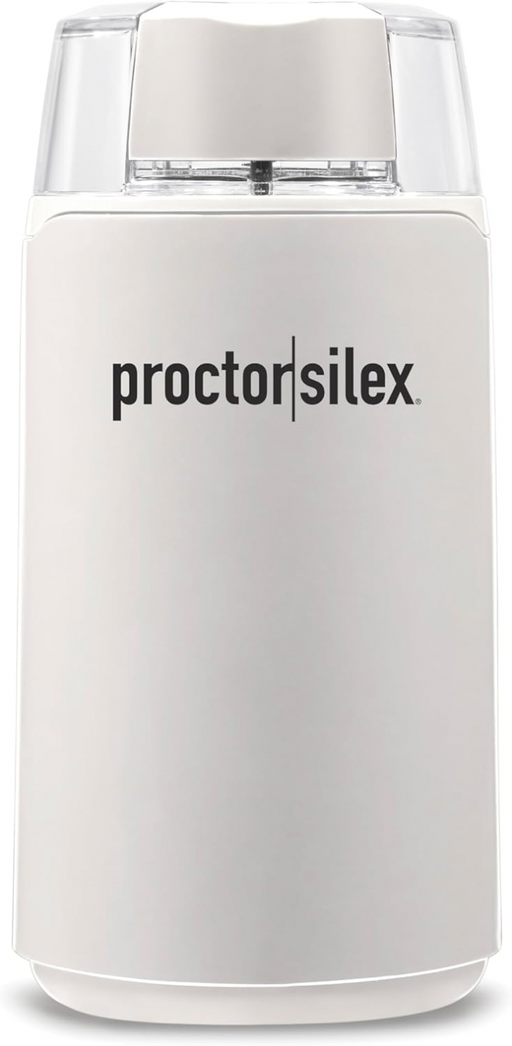 Amazon offers Proctor Silex Electric Coffee Grinder for Beans, Spices and More, Stainless Steel Blades, 12 Cups, White for + free shipping with Prime. Product Description:- SIMPLE AND INTUITIVE: The electric coffee grinder is so simple to use that you'll want to drink flavorful coffee made from freshly ground coffee beans everyday. Just press the button to grind coffee and release to stop grinding.