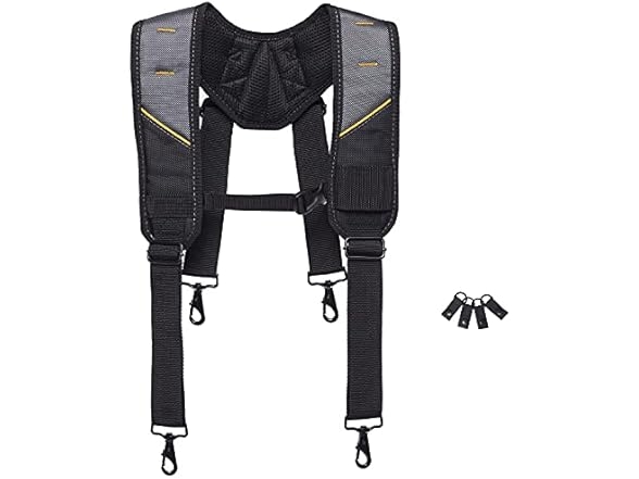 Product Description: 4 belt loops that make it compatible with almost any belt Comfortable padding evenly distributes the weight of heavy tool belts Adjustable straps at the front and rear Chest strap Rear hanging loop Reinforced stress points Durable 1680D fabric