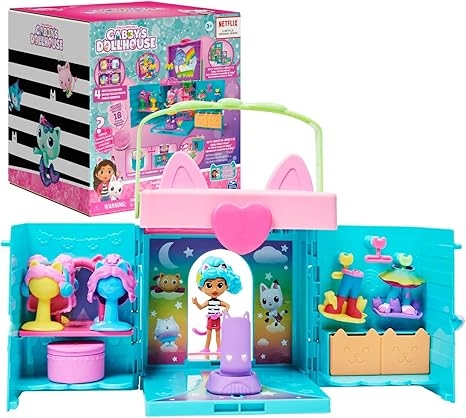 Amazon offers Gabby’s Dollhouse, Dress-Up Closet Portable Playset with a Gabby Doll, Surprise Toys and Photo Shoot Accessories, Kids Toys for Ages 3 and up for + free shipping with Prime. Product Description:- FOUR PLAY AREAS: Do Gabby’s hair and make-up, in the vanity room; Pick out an outfit in the closet room; Then, after a quick catwalk twirl on the pedestal, climb the rope ladder for her photo shoot!
