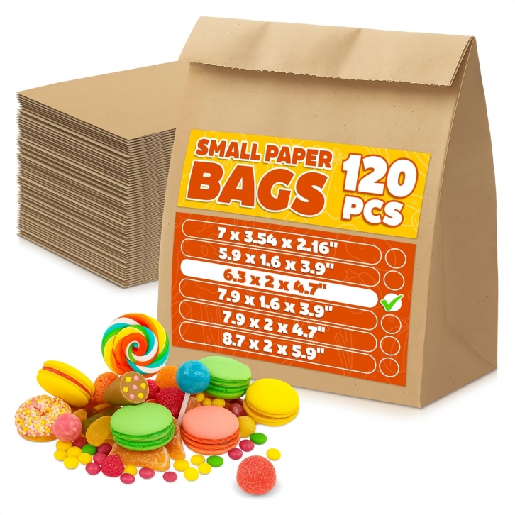 Amazon offers Set of 120 Tiny Small Brown Paper Bags - Sturdy Brown Lunch Bags for Snacks, Nuts, Popcorn, Cookies, Candies, Party Favors & Gifts - Durable with Convenient Size (6.3x2x4.7") for Home and Business for after coupon + free shipping with Prime. Apply Code: COM2UZB7Product Description:- Mini Paper Bags Bulk: Durable brown cookie bags keep brownies, biscotti, or pralines fresh. Each snack bag also works as little paper bags for parties, bake sales, or homemade favors.