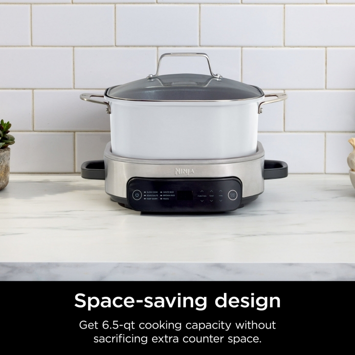 Product Description: Meet the Ninja 10-in-1 Everyday PossibleCooker, MC1100 the everyday PossibleCooker that replaces 10 cooking appliances and tools. This all-in-one cooker features a 6.5-qt cooking pot that can cook up to 4 cups of rice, 16 oz of pasta, or a 7-lb roast, perfect for preparing delicious one pot dinners or quick, hearty sides to compliment your main dishes. Choose between 6 cooking functions: Slow Cook, Sear/Sauté Keep Warm, White Rice, Brown Rice, and Pasta. Cook everything from fluffy grains to full meals for endless possibilities, every day. It’s fast and simple, just set it and forget it. Toss all your ingredients into the cooking pot and come back to a flavorful, hassle-free meal your whole family will love. This versatile multi-cooker eliminates the need for an oven and stove, resulting in a faster, easier cleanup. Plus, its compact design fits easily on your countertop and has cool-touch handles on the base for easy transport to gatherings. With the Ninja Foodi PossibleCooker, the possibilities are endless.