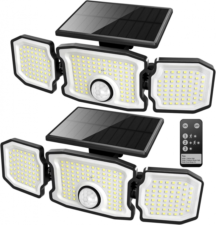 Amazon offers Solar Lights Outdoor Waterproof- 2800LM 200LED Solar Motion Sensor Lights, 3 Heads & 3 Modes Flood Lights, 270° Wide Angle Solar Powered Security Lights for Yard, Garage(2 Pack) for + free shipping with Prime. Product Description:- 【Remote Control & 3 Smart Lighting Modes】Take command wirelessly! Each solar motion light outdoor includes a remote to easily switch modes: ①Motion High Lights Brightness Mode②Dim Light Motion Sensing Mode ③Always On High Brightness Mode.Perfect flexibility for any yard or driveway need