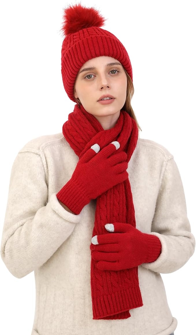 Amazon offers Double Couple 3pcs Winter Women scarf and hat and Touch Screen Gloves Set for Women Knit Hat with Faux Fur Ball Scarves Glove for after coupon + free shipping with Prime. Note: Clip coupon on the product page! Product Description:- Package List: 3 pcs hat gloves scarf set women includes a loose-fitting beanie for women with with cute artificial fur pompom, cozy touchscreen winter gloves, and a winter scarf for women