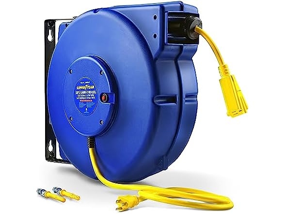 Woot offers GOODYEAR Extension Cord Reel Retractable 12AWG x 65' Foot 3C/SJT Heavy Duty Commercial Cable Triple Tap Connector Power 15A 125VAC 1875W for $149.99 (orig. $299.99) + free shipping with Prime. Product Description:- REEL SPECS - The 12AWG x 65' Foot 3C/SJT Cord and Triple Tap (S3) Connector; The 3 Core Wire Grounded Cable is rated at 15A 125VAC 1875W 60Hz; cETLus, Listed approved and certified, including quality tested.