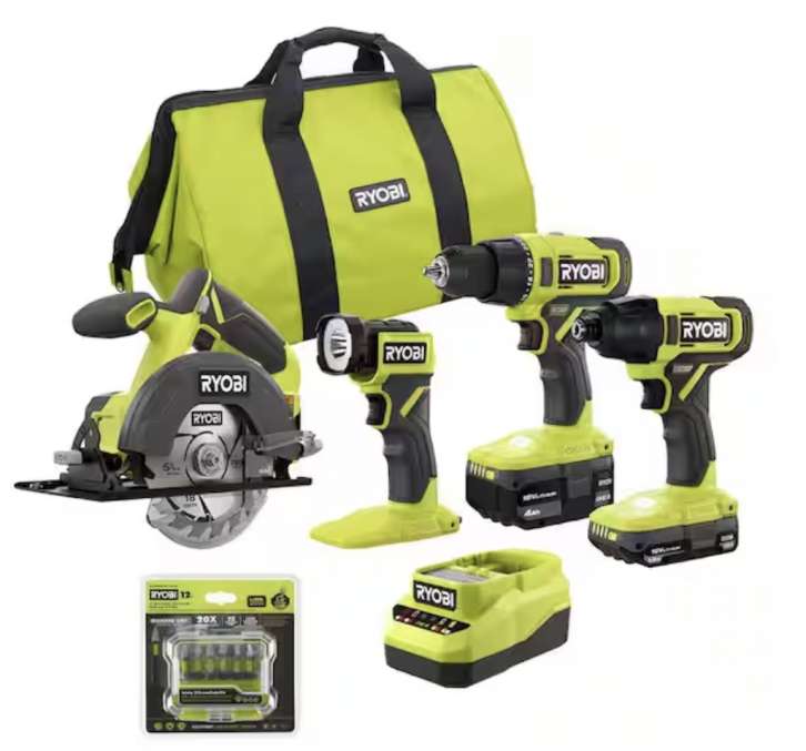 Product Description: RYOBI introduces the ONE+ 18V Cordless 4-Tool Combo Kit with 1.5 Ah Battery, 4.0 Ah Battery, Charger, and Diamond Grit Driving Set (12-Piece). The ONE+ Drill/Driver provides up to 515 in./lbs. of torque and features a 1/2 in. ratcheting metal chuck to match your drilling and driving needs. The ONE+ Impact Driver is able to drive long deck screws or large lag screws with ease by delivering 3,400 IPM along with 1800 in./lbs. of torque controlled by a variable-speed trigger that churns out 2,700 RPM. The ONE+ 5-1/2 in. Circular Saw has the ability to cut through 2-by material, with over 215 cuts per charge. The ONE+ LED Light also has 280 Lumens of light output and has a 130° pivoting head for adjustable light beam direction. The ONE+ 4.0 Ah and 1.5 Ah Batteries feature an integrated high visibility fuel gauge to monitor remaining runtime. The 18V Charger is compatible with RYOBI ONE+ Lithium-ion Batteries. Best of all, this kit is part of the RYOBI ONE+ System of over 300 Cordless Products that all work on the same battery platform. Backed by the RYOBI 3-Year Manufacturer's Warranty, the 18V ONE+ 4-Tool Combo Kit includes (1) PCL206 18V 1/2 in. Drill/Driver, (1) PCL235 18V 1/4 in. Impact Driver, (1) PCL500 5-1/2 in. Circular Saw, (1) PCL660 LED Light, 18T Carbide Blade, Hex Wrench, (1) 18V 4.0 Ah Lithium-ion Battery, (1) 18V 1.5 Ah Lithium-ion Battery, Charger, Tool Bag, 2 in. Diamond Grit Driving Set (12-Piece), and Operator’s Manuals. Category: Tools & Home Improvement Posted on 13 February 2026, 06:22 AM